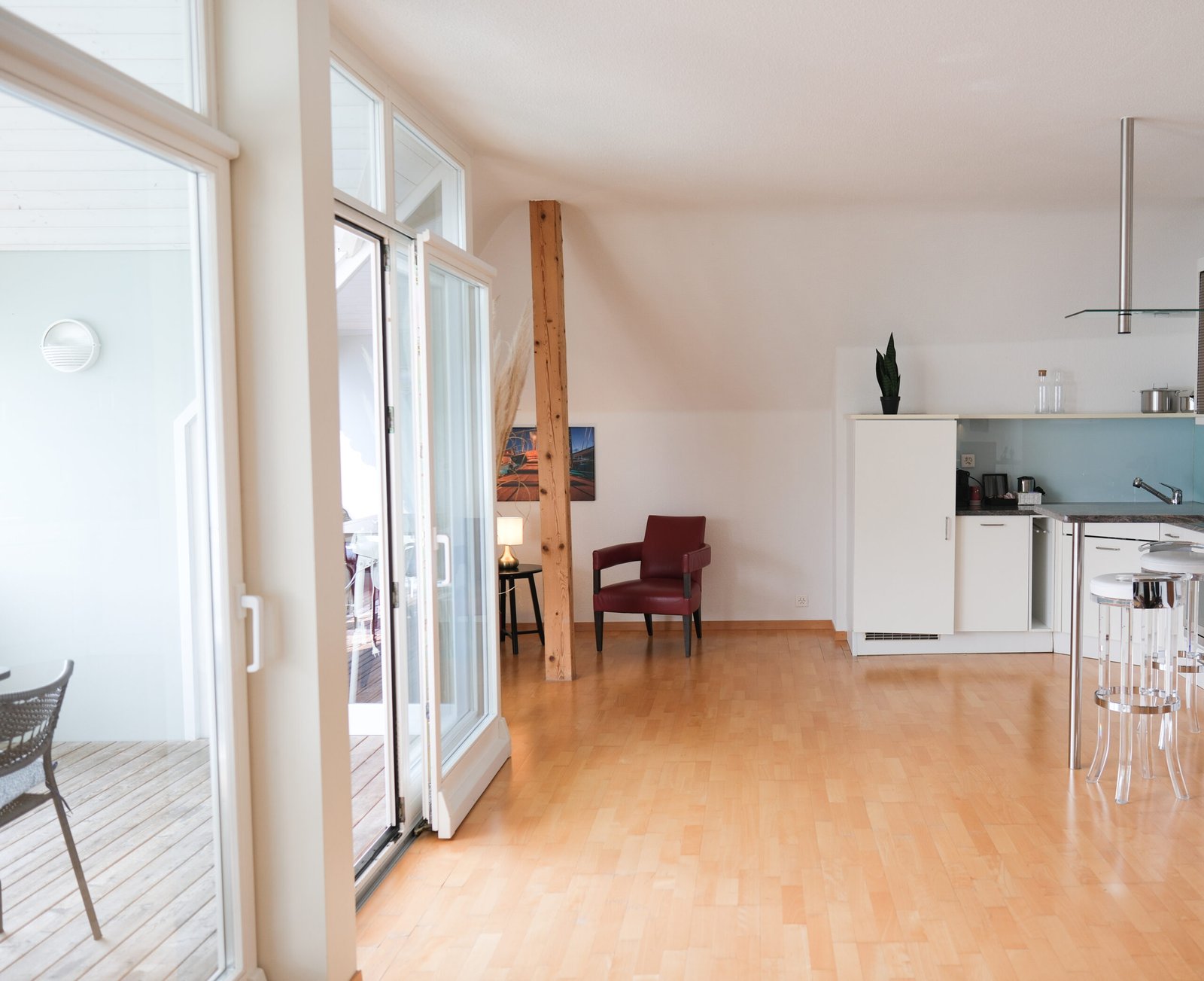 Die Wohnung befindet sich im 5. Stock des Hotels und besteht aus einem Schlafzimmer mit einem King Size Doppelbett und einem ausziehbaren Doppelschlafsofa, einem Badezimmer mit Dusche/WC und grosser Badewanne, einem offenen Wohnbereich sowie einer voll ausgestatteter Küche. Der grosse Balkon mit fantastischem Panoramablick lädt zum Verweilen ein.